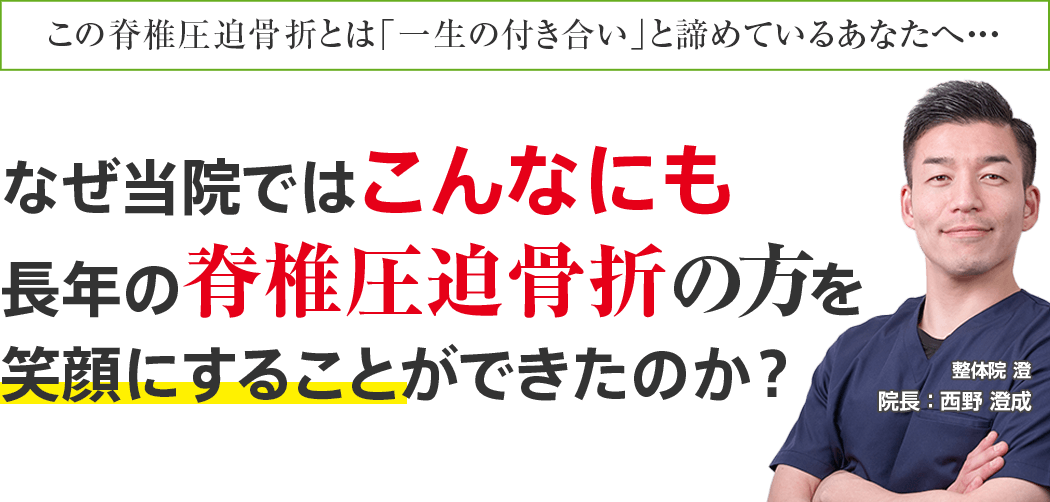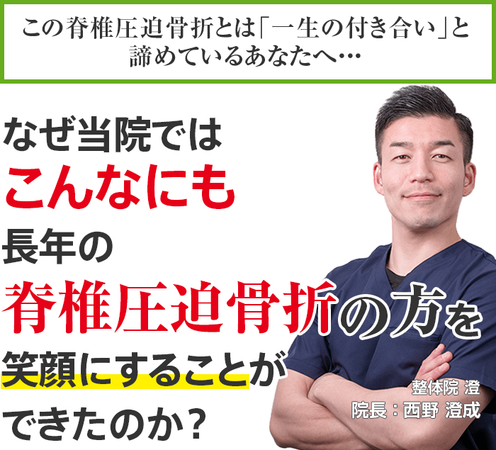 私は、すぐに痛みが再発するようなその場しのぎの施術や、小手先の技術を振りかざし、表面的な痛みが取れればいいということは全く考えていません。あなたのその脊椎圧迫骨折を改善したいと本気で考えています。