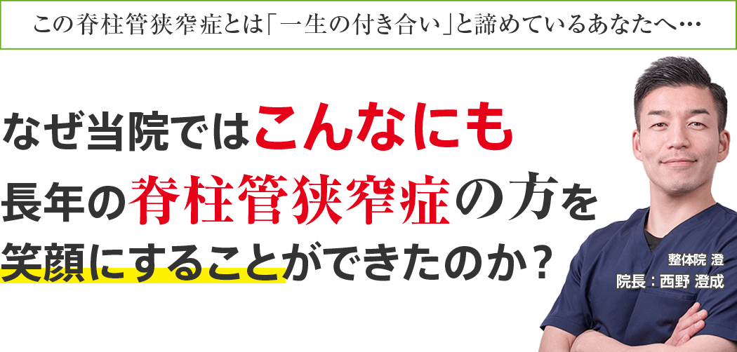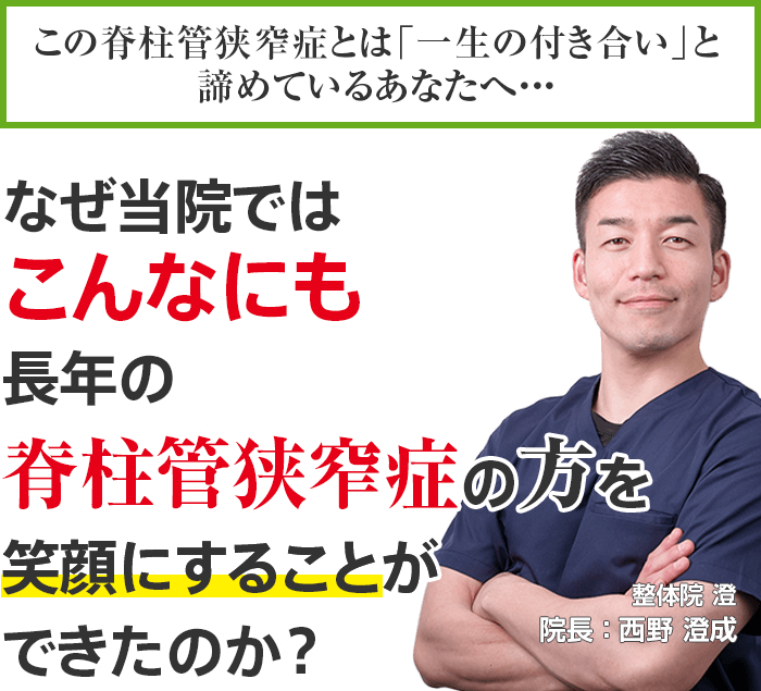 私は、すぐに痛みが再発するようなその場しのぎの施術や、小手先の技術を振りかざし、表面的な痛みが取れればいいということは全く考えていません。あなたのその脊柱管狭窄症を改善したいと本気で考えています。